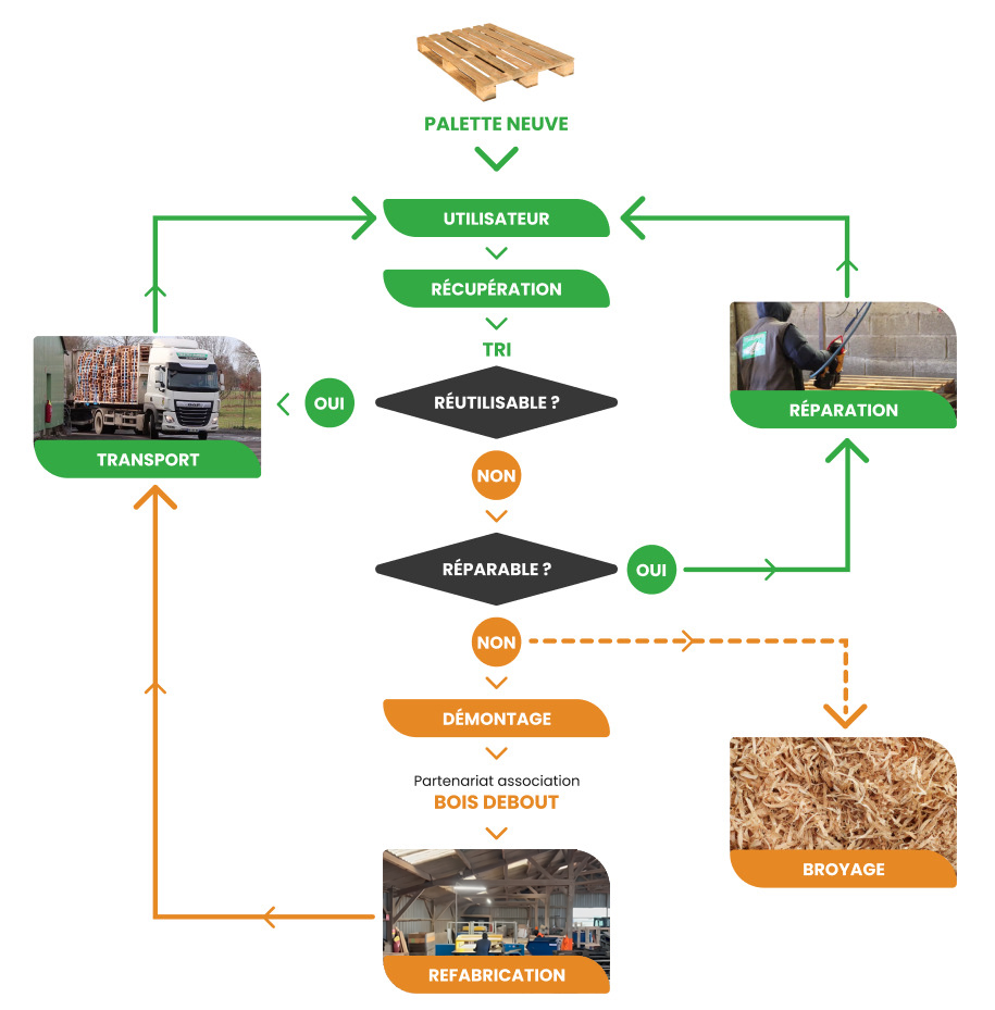 En dernier recours, si les palettes sont jugées irrécupérables ainsi que les chutes de bois, celles-ci seront revalorisées en biomasse ou en matière pour des panneaux de particules.