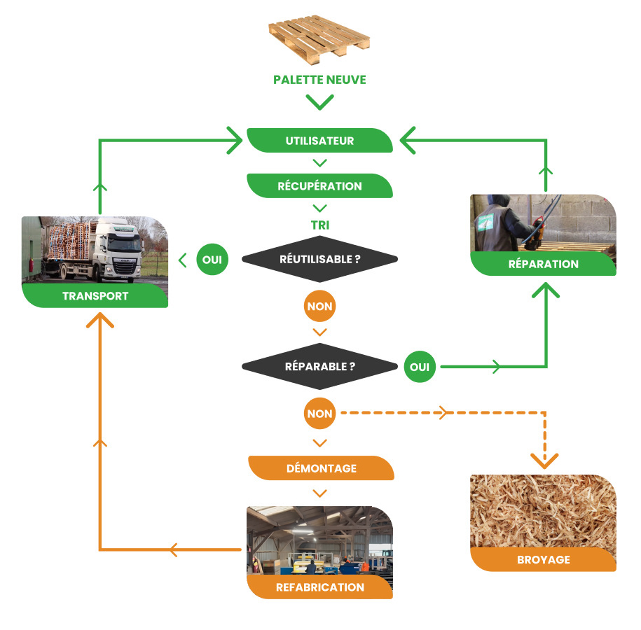 En dernier recours, si les palettes sont jugées irrécupérables ainsi que les chutes de bois, celles-ci seront revalorisées en biomasse ou en matière pour des panneaux de particules.